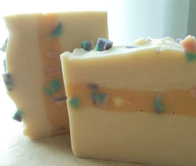 As long as I'm on the party theme, here is one of my newly cured soaps. I made it with scrap soap diced into little chunks and a never-to-be-repeated fragrance blend, the dribbles and drops of five different fruity scents. I referrred to it as the "leftover" soap during its cure but it would hardly fly out the door with a name like that. My sister thought it looked like a party, so ta-da--Party Time.